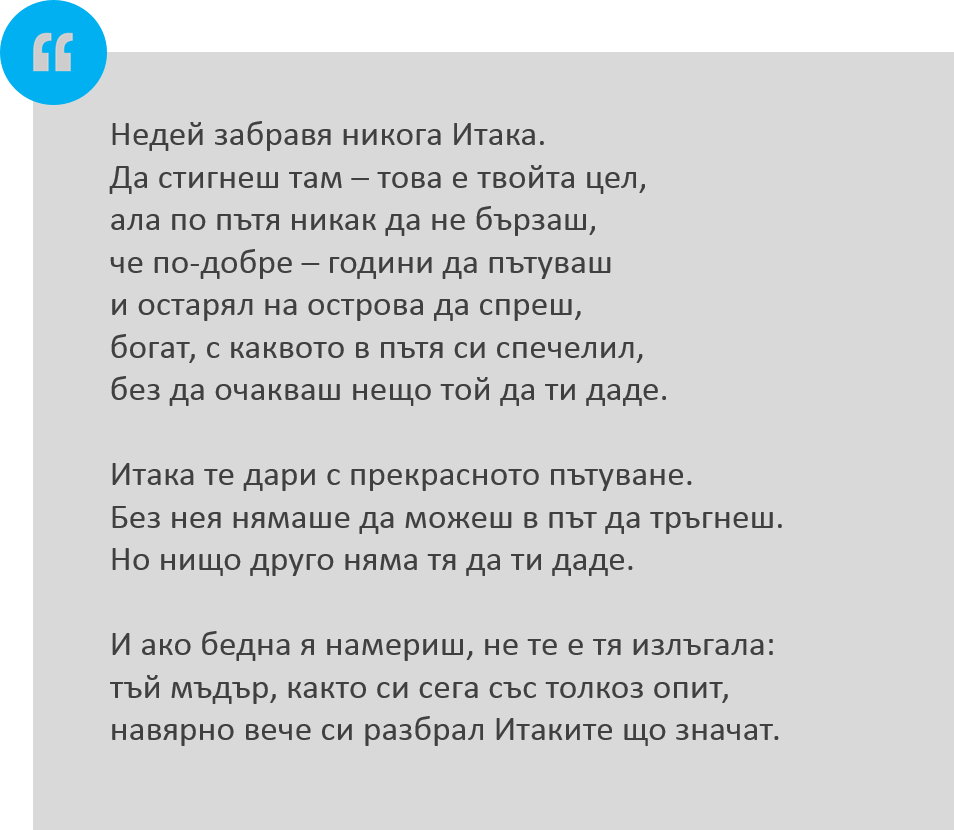 Тя се сдоби с толкова нови запознанства, приятели, знания, че за нея Итака беше важна, но по-важен беше пътят към нея и натрупания опит през това време.